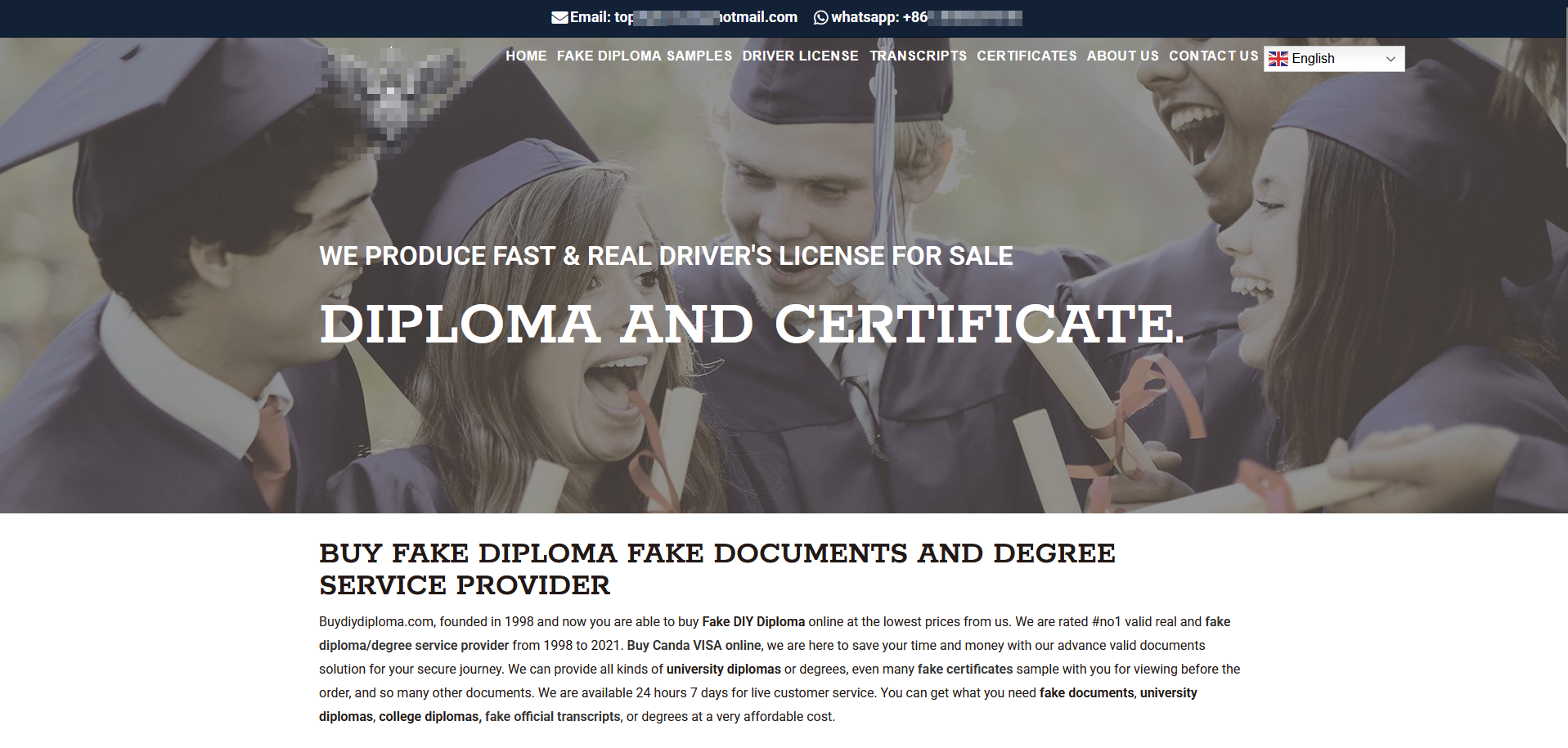 This cluster of websites specializing in fraudulent documents is mainly focused on fake diplomas, although some sites also offer fake papers such as driving licenses or ID cards. To reach their clientele, we have identified three distribution vectors: