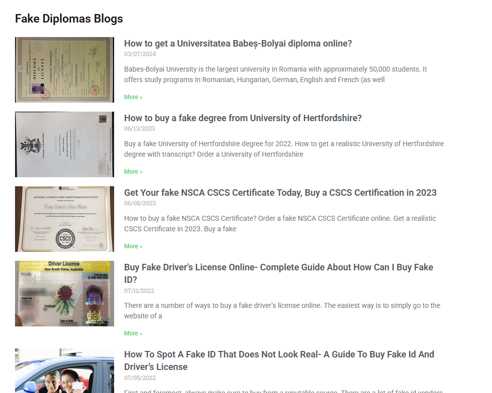 To maintain a high ranking in Google search results, FakeDocsHub features a blog with various articles always centered on the same topics and contain repetitive texts.