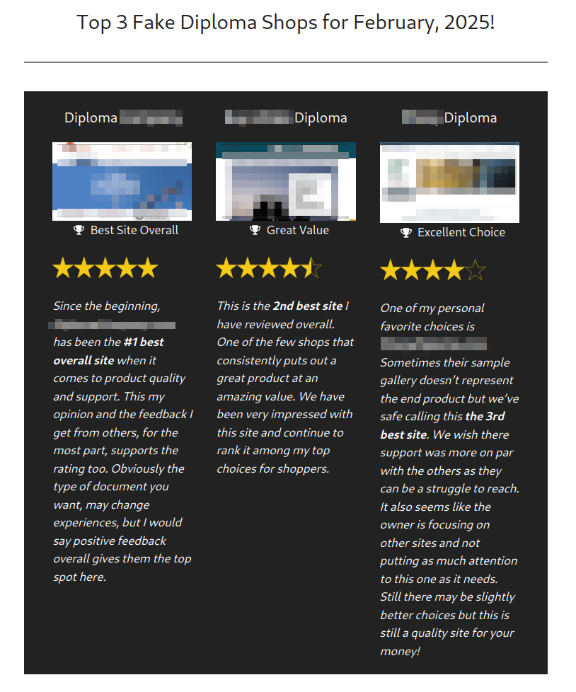 For this cluster, we started with a site found through standard Google search, selecting the first result. The site, which specializes in the sale of fake diplomas, exhibits the typical characteristics of such platforms, along with several distinctive features: