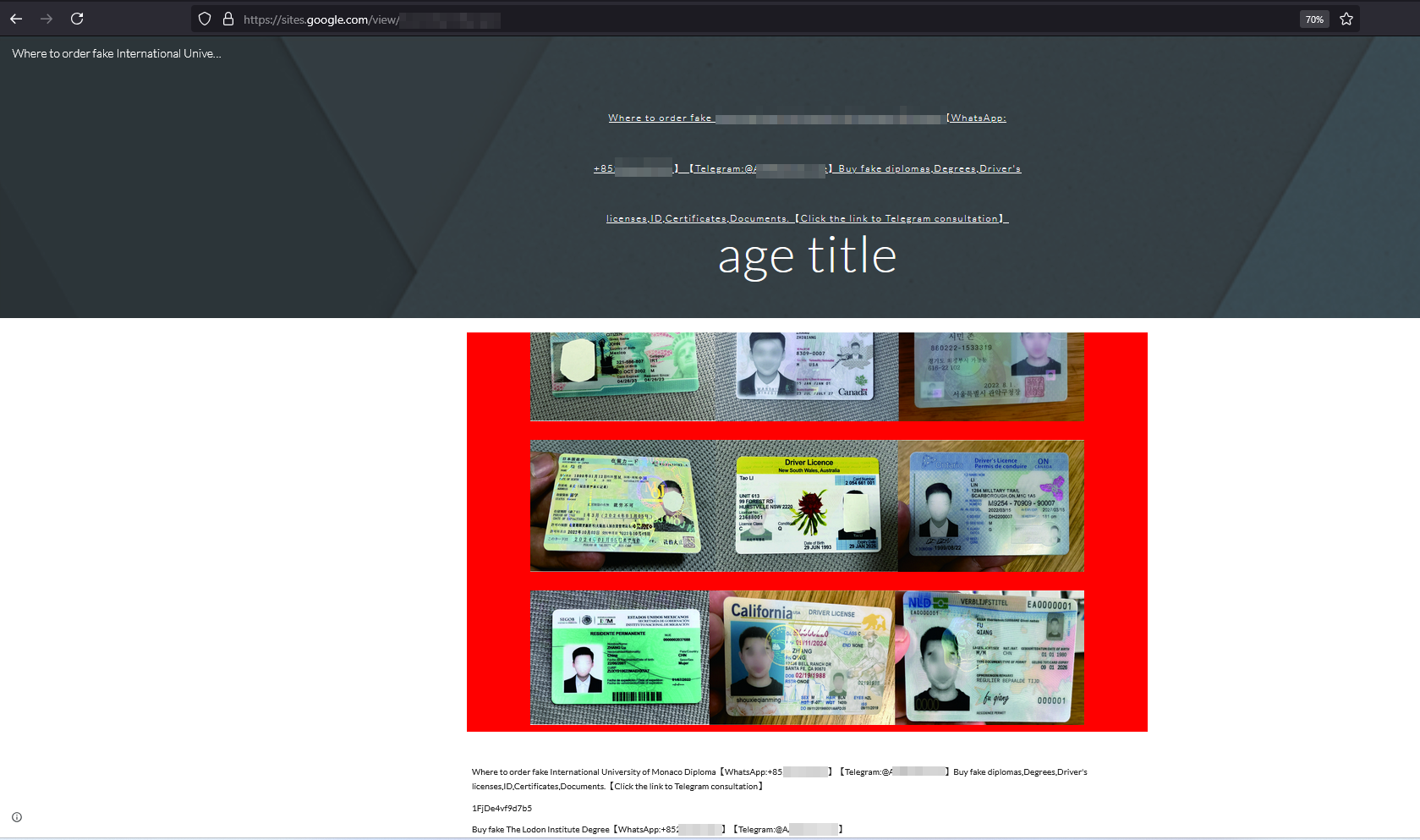 Some counterfeiters take it a step further by creating Google sites or free websites, populating them with hundreds of keywords and phrases that potential customers are likely to search for. These sites also include links to their sales platforms as well as contact methods such as email, Telegram, WeChat, etc.