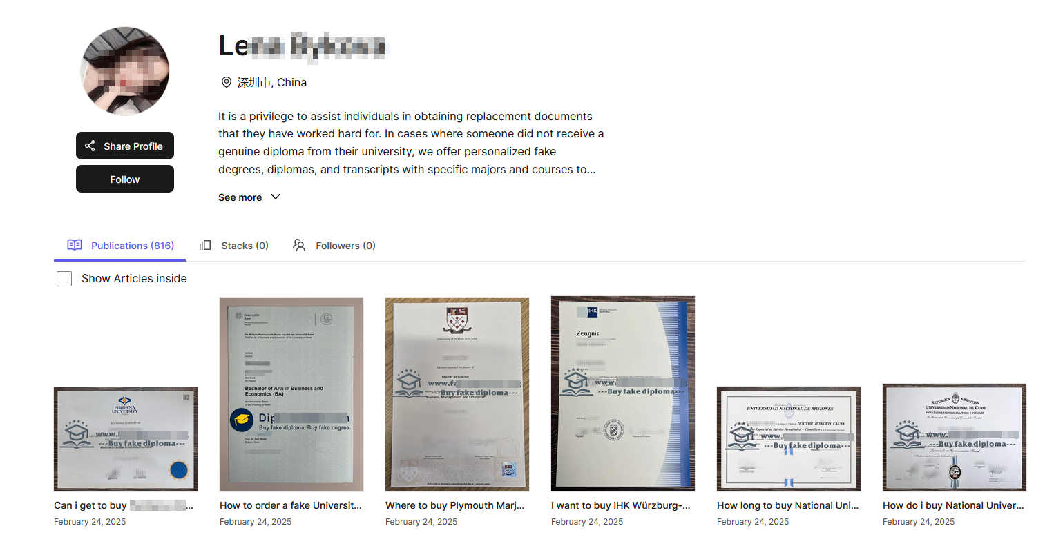 The investigation into this cluster started with the document-sharing platform Issuu. Numerous accounts on this platform promote sites that sell fake documents, including some that specialize in counterfeit diplomas. We became interested in one of these accounts, which was posing as a Chinese user living in Shenzhen, China. On this account, we found two Chinese phone numbers, one linked to a WhatsApp account and the other to a WeChat account, along with an email address and the URL of the site selling fake diplomas.
